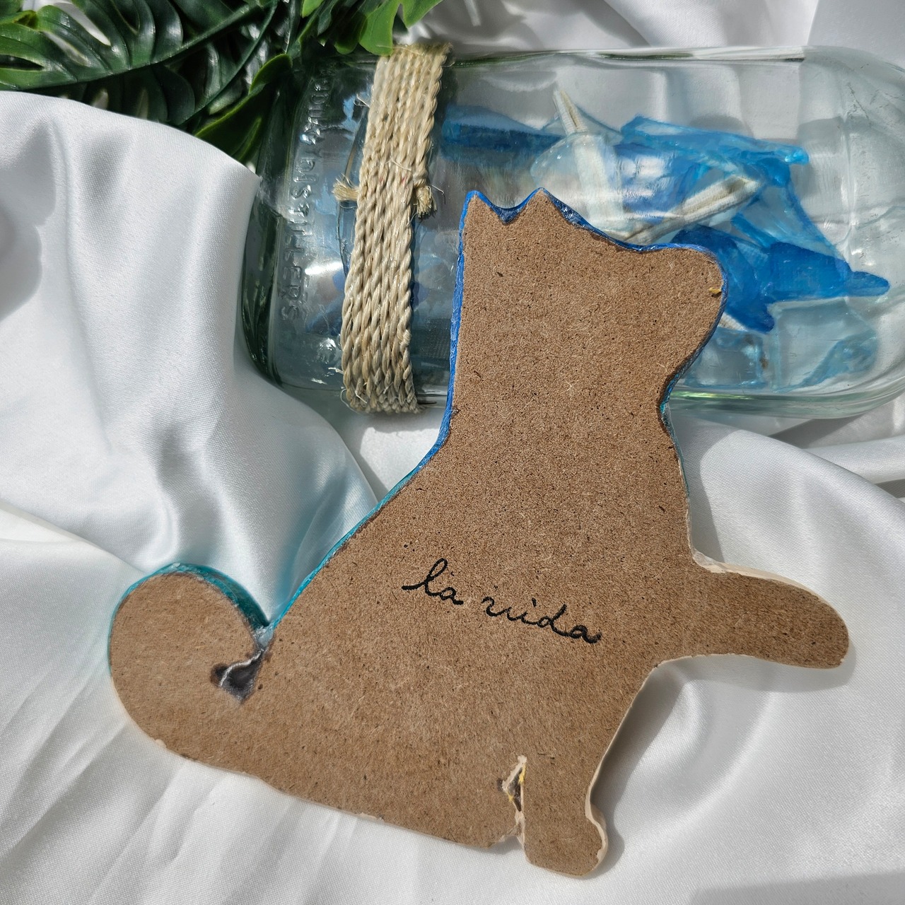 こちらはMDFのボードにアクリル絵の具とマイカパウダーを使用してグラデーションをつけております。砂浜部分には本物の貝殻でデコレーションしています。